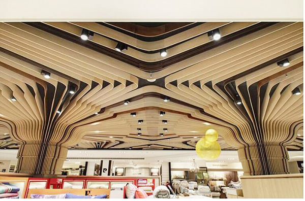 弧形鋁方通吊頂的設計,有基本的兩點要求,一個是底寬的要求,另一個是厚度的基本要求。兩者都是因為加工工藝的限制從而受到限制,波浪造型鋁方通吊頂的底寬,一般建議在30mm以上,小30mm,因為波浪造型鋁方通吊頂,是通過電焊固定成型的,電焊的過程中,需要保證整個鋁方通的平直度,如果底寬太小,電焊加工的過程中很容易造成歪曲,從而影響整根鋁方通的效果,其次,厚度的基本要求,是因為波浪造型鋁方通吊頂燒焊加工而成,燒焊的焊點比較多,溫度較高,如果是太薄的板子,一燒焊就穿了,這樣自然是加工不了的,因而波浪造型鋁方通吊頂厚度要求在2.0mm以上