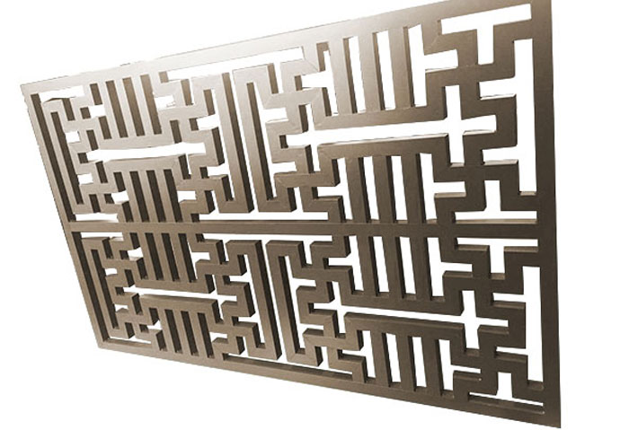 鏤空的雕花是采用數控沖床進行加工制作的,既可以雕刻出規則形狀的雕花,也可加工成不規則形狀,甚至可以雕刻出鏤空的各種字體。鋁單板產品的優點很多,相信行內人士基本上都多多少少了解一些,我在此就不一一贅述。